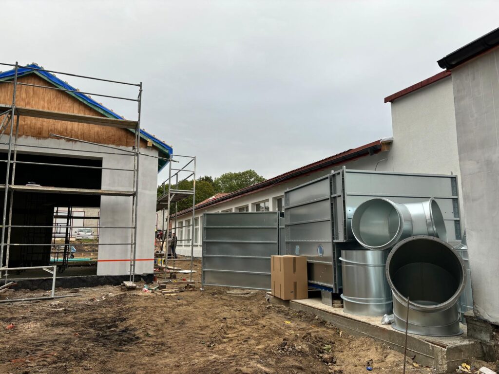 A obok, w wolnostojącym budynku warsztatów szkolnych, wykonano roboty rozbiórkowe, postawiono ściany zewnętrzne, trwają prace nad wykonaniem konstrukcji dachu z pokryciem, roboty elewacyjne i izolacyjne, roboty posadzkowe i wykończeniowe. Budynek ten będzie pełnił funkcję magazynowo-pomocniczą.