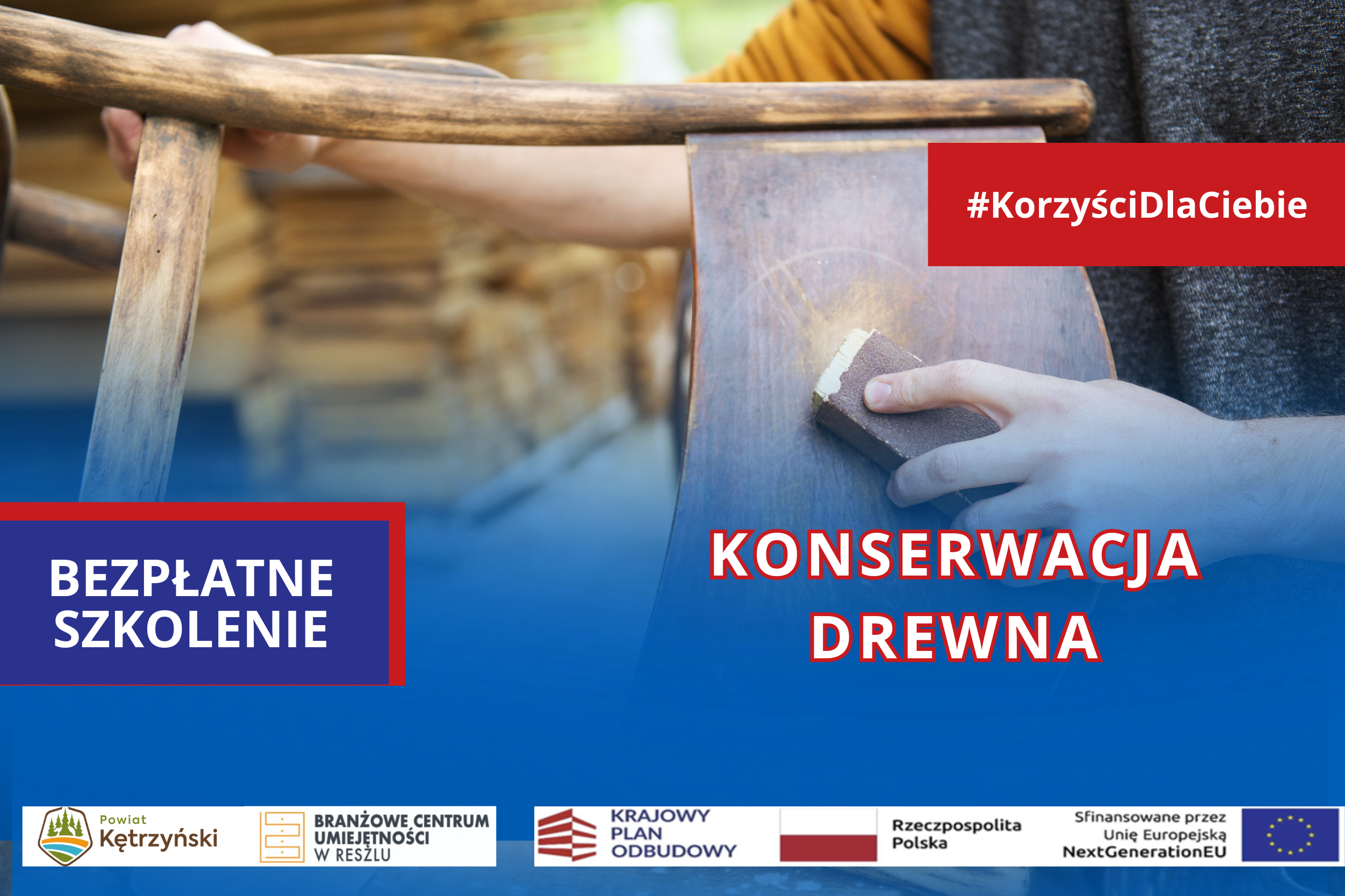 Branżowe Centrum Umiejętności w Dziedzinie Przemysłu Meblarskiego w Reszlu serdecznie zaprasza osoby dorosłe do wzięcia udziału w bezpłatnym szkoleniu pt.: „Konserwacja drewna”, które odbędzie się w dniach 08.12.2025 r. – 11.12.2025 r., w Branżowym Centrum Umiejętności w Dziedzinie Przemysłu Meblarskiego w Reszlu, przy ul. Wojska Polskiego 3A, 11-440 Reszel.