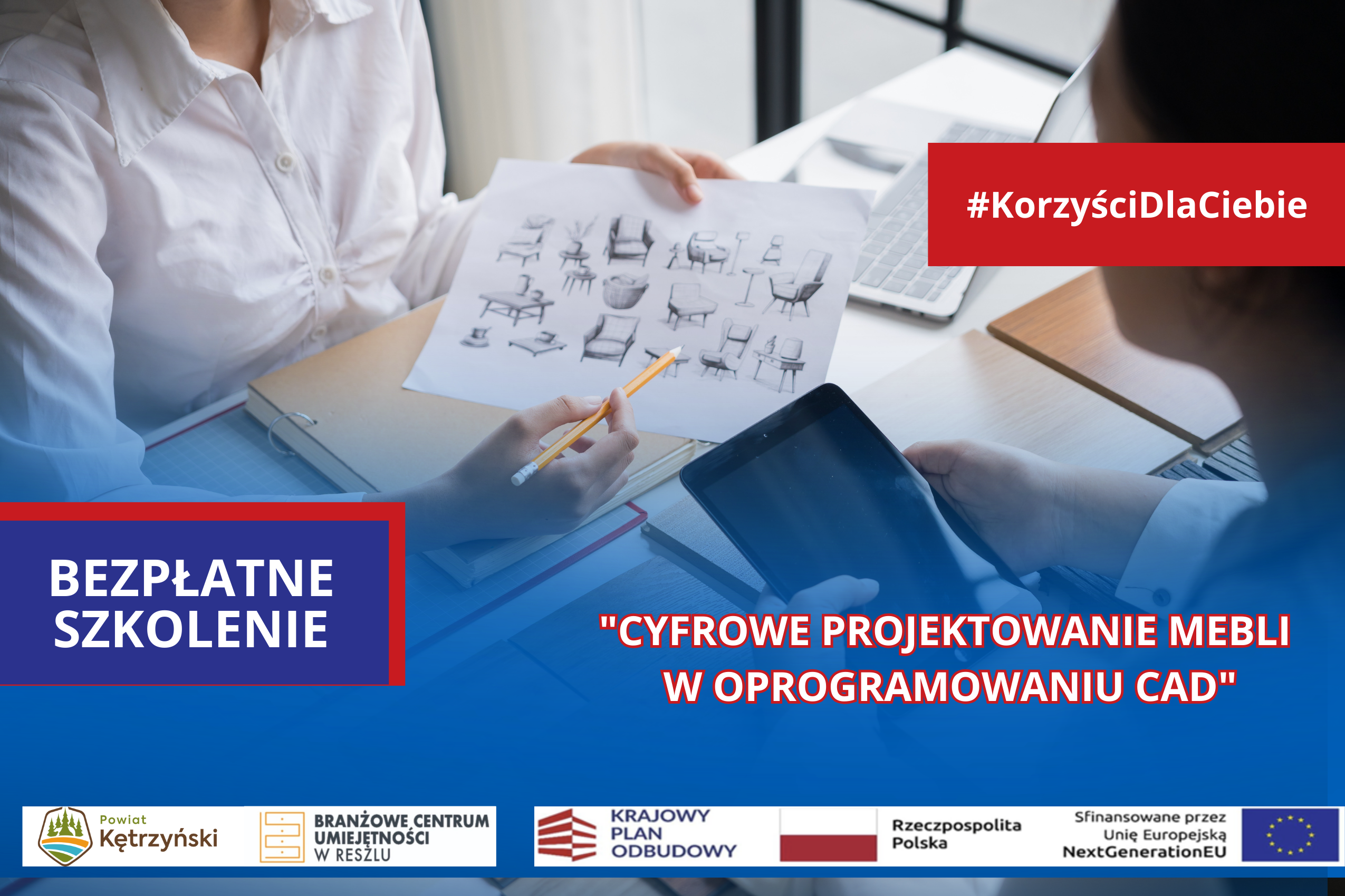 Branżowe Centrum Umiejętności w Dziedzinie Przemysłu Meblarskiego w Reszlu serdecznie zaprasza OSOBY DOROSŁE od 25 roku życia (włącznie) do 64 lat (włącznie), do wzięcia udziału w BEZPŁATNYM szkoleniu pt.:„Cyfrowe projektowanie mebli w oprogramowaniu CAD”, które odbędzie się w terminie: 09.03.2026 r. – 12.03.2026 r., w Branżowym Centrum Umiejętności w Dziedzinie Przemysłu Meblarskiego w Reszlu, przy ul. Wojska Polskiego 3A, 11-440 Reszel.