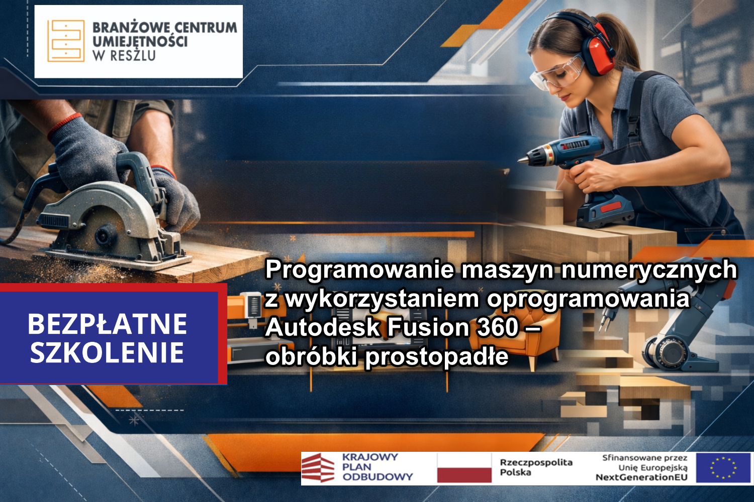 Branżowe Centrum Umiejętności w Dziedzinie Przemysłu Meblarskiego w Reszlu serdecznie zaprasza OSOBY DOROSŁE od 25 roku życia (włącznie) do 64 lat (włącznie), do wzięcia udziału w BEZPŁATNYM szkoleniu pt.: „Programowanie maszyn numerycznych z wykorzystaniem oprogramowania Autodesk Fusion 360 – obróbki prostopadłe”, które odbędzie się w terminie: 23.03.2026 r. – 26.03.2026 r., w Branżowym Centrum Umiejętności w Dziedzinie Przemysłu Meblarskiego w Reszlu, przy ul. Wojska Polskiego 3A, 11-440 Reszel.