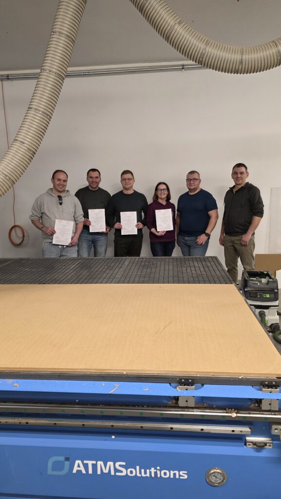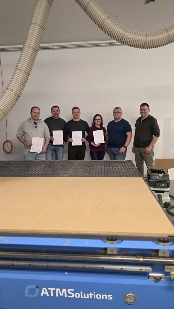 Kurs trwał 120 godzin i zakończył się uroczystym wręczeniem uczestnikom kursu Branżowych Certyfikatów Umiejętności. Nasi kursanci są teraz wykwalifikowanymi adeptami, którzy posiadają umiejętności cyfrowego projektowania mebli i dowolnych elementów oraz przenoszenia ich za pomocą technologii i maszyn cnc na drewno.