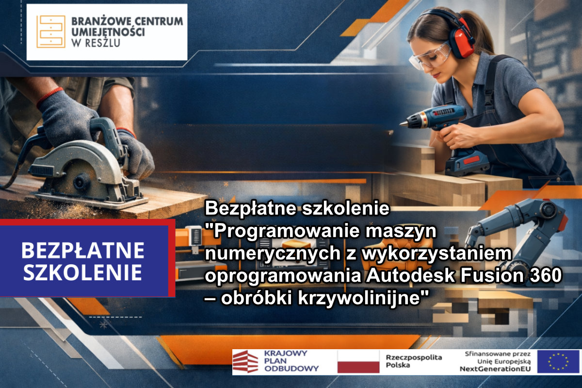 Branżowe Centrum Umiejętności w Dziedzinie Przemysłu Meblarskiego w Reszlu serdecznie zaprasza OSOBY DOROSŁE od 25 roku życia (włącznie) do 64 lat (włącznie), do wzięcia udziału w BEZPŁATNYM szkoleniu pt.: „Programowanie maszyn numerycznych z wykorzystaniem oprogramowania Autodesk Fusion 360 – obróbki krzywolinijne”